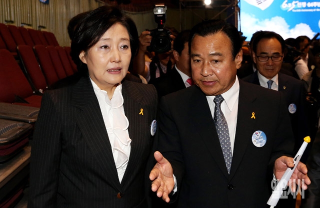 이완구 새누리당 원내대표(오른쪽)와 박영선 새정치민주연합 원내대표가 25일 서울 잠실실내체육관에서 열린 6ㆍ25전쟁 64주년 행사를 마친 뒤 이야기를 나누고 있다.