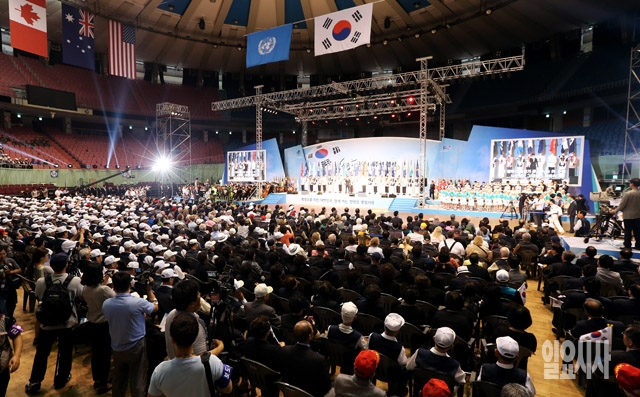 25일 서울 잠실실내체육관에서 열린 6ㆍ25전쟁 64주년 행사에서 참석자들이 행사를 지켜보고 있다.