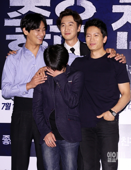25일 서울 CGV 왕십리점에서 열린 영화 '좋은 친구들'(감독 이도윤) 언론시사회에서 감독과 출연배우들이 포토타임을 갖고 있다. 뒷줄 왼쪽부터 주지훈, 이광수, 지성, 앞줄은 이 감독.