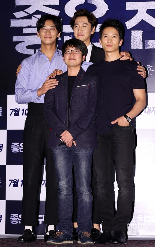 25일 서울 CGV 왕십리점에서 열린 영화 '좋은 친구들'(감독 이도윤) 언론시사회에서 감독과 출연배우들이 포토타임을 갖고 있다. 뒷줄 왼쪽부터 주지훈, 이광수, 지성, 앞줄은 이 감독.