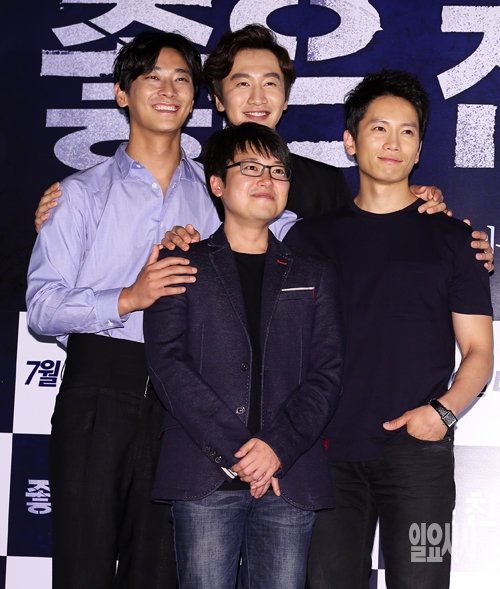 25일 서울 CGV 왕십리점에서 열린 영화 '좋은 친구들'(감독 이도윤) 언론시사회에서 감독과 출연배우들이 포토타임을 갖고 있다. 뒷줄 왼쪽부터 주지훈, 이광수, 지성, 앞줄은 이 감독.