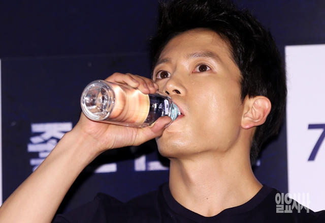 배우 지성이 25일 서울 CGV 왕십리점에서 열린 영화 '좋은 친구들'(감독 이도윤) 언론시사회에서 물을 마시고 있다.