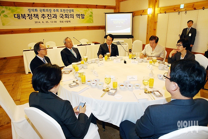 박관용 전 국회의장과 박영선 새정치민주연합 원내대표 등이 참석한 가운데, 25일 국회 사랑재에서 대북정책 추진과 국회의 역할이라는 주제의 오찬간담회가 열리고 있다.