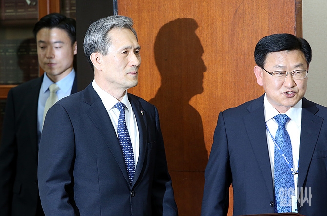 김관진 국가안보실장 겸 국방부 장관이 25일 오후 국회 국방위원회 전체회의 참석을 위해 회의실로 입장하고 있다.