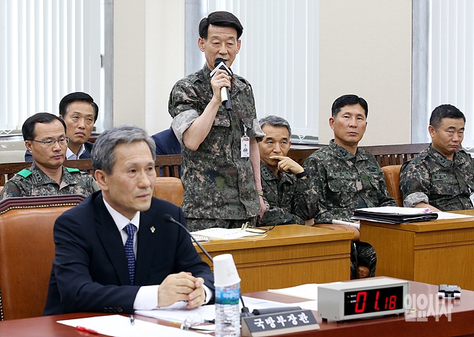 김관진 국가안보실장 겸 국방부 장관이 25일 오후 국회에서 열린 국방위원회 전체회의에 출석한 가운데, 강원도 동부전선 GOP 총기난사 사고와 관련해 한 국방부 관계자가 대신 답변하고 있다.