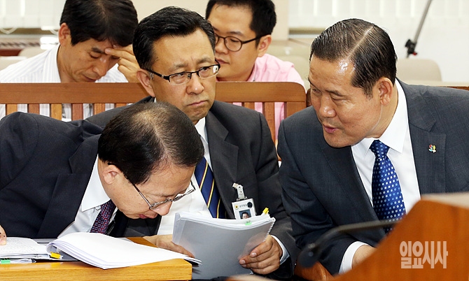 국방부 관계자들이 25일 오후 국회에서 열린 국방위원회 전체회의 도중 이야기를 나누고 있다.