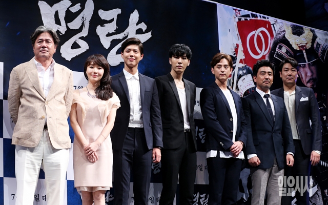 26일 서울 CGV 압구정점에서 열린 영화 '명량'(감독 김한민) 제작보고회에서 출연배우들이 포토타임을 갖고 있다. 왼쪽부터 최민식, 이정현, 박보검, 노민우, 권율, 류승룡, 조진웅.