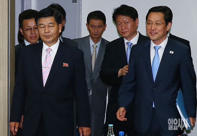 26일, 개성공단 남북공동위원회 제5차 회의가 열리는 개성공단 종합지원센터에서 북측 대표단 위원장인 박철수 중앙특구개발지도총국 부총국장(오른쪽)과 이강우 통일부 남북협력지구발전기획단장(왼쪽)을 비롯한 대표단이 회의장 안으로 입장하고 있다. (사진공동취재단)