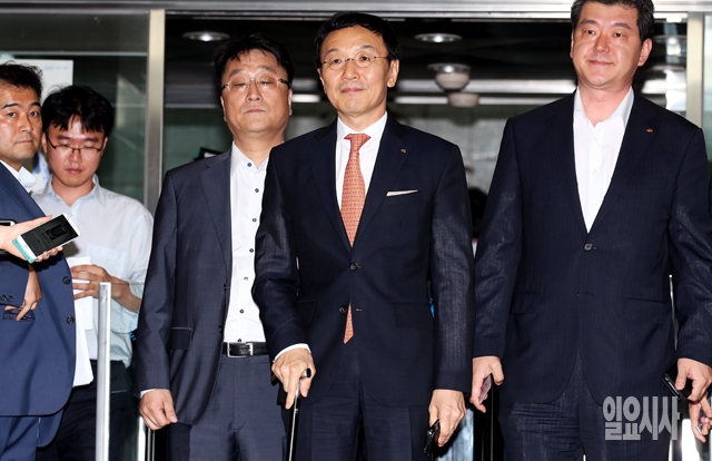 이건호 국민은행장(가운데)이 26일 서울 여의도 금융감독원에서 열린 제재심의위원회에 참석하고 있다.