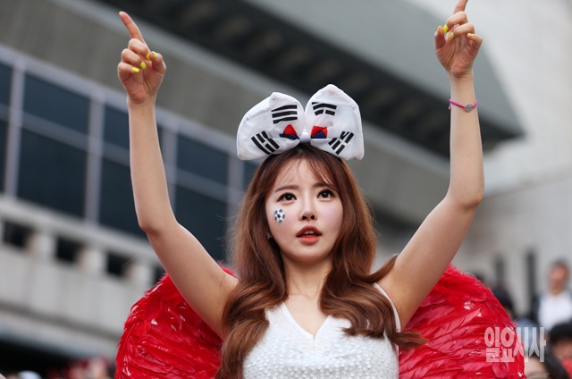 2014 브라질 월드컵 조별리그 H조 대한민국과 벨기에의 경기가 열린 27일 서울 광화문광장에 모인 붉은악마 및 시민들이 경기를 보며 응원을 펼치고 있다.