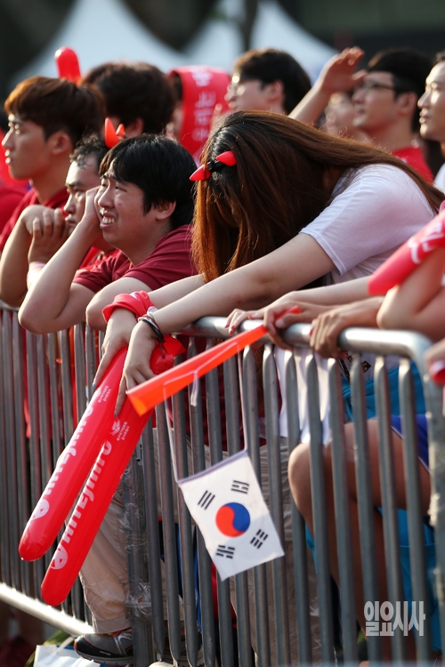 2014 브라질 월드컵 조별리그 H조 대한민국과 벨기에의 경기가 열린 27일 서울 광화문광장에 모인 붉은악마 및 시민들이 경기를 보며 응원을 펼치고 있다.