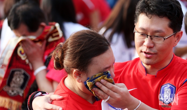 2014 브라질 월드컵 조별리그 H조 대한민국과 벨기에의 경기가 열린 27일 서울 광화문광장에 모인 붉은악마 및 시민들이 경기가 끝나자 아쉬움에 눈물을 훔치고 있다.