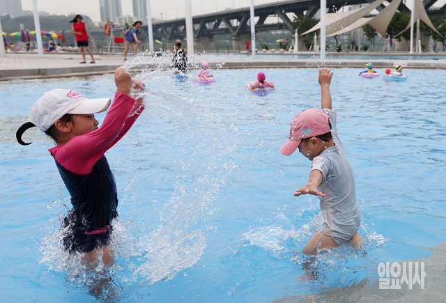 한강 야외수영장 개장일인 27일 서울 광진구 뚝섬 야외수영장을 찾은 어린이들이 물놀이를 하며 더위를 식히고 있다.