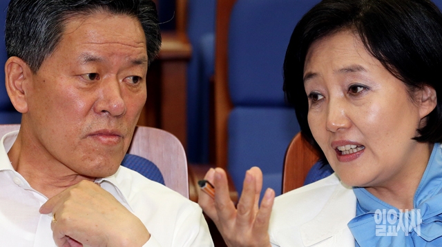 27일 서울 여의도 국회에서 열린 새정치민주연합 의원 워크숍에서 박영선 원내대표(오른쪽)와 주승용 사무총장이 대화하고 있다.