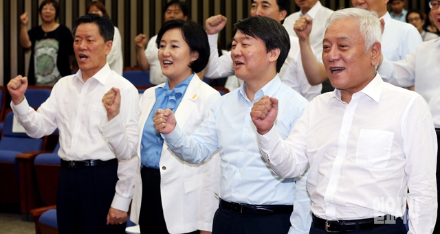 27일 서울 여의도 국회에서 열린 새정치민주연합 의원 워크숍에서 김한길(오른쪽부터), 안철수 공동대표와 박영선 원내대표, 주승용 사무총장이 파이팅을 외치고 있다.