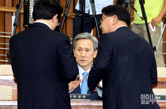 김관진 국방부 장관이 30일 서울 여의도 국회에서 열린 세월호침몰사고진상규명국정조사 특별위원회 전체회의에 참석해 관계자들과 기관보고 준비를 하고 있다.
