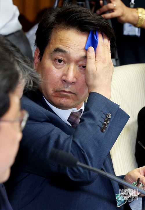30일 서울 여의도 국회에서 열린 세월호침몰사고진상규명국정조사 특별위원회 전체회의에서 심재철 위원장이 땀을 닦고 있다.