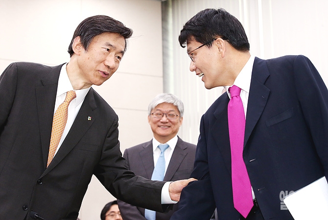 윤병세 외교부 장관이 30일, 국회에서 열린 외교통일위원회 전체회의 직전, 윤상현 새누리당 사무총장(오른쪽)과 대화하고 있다.