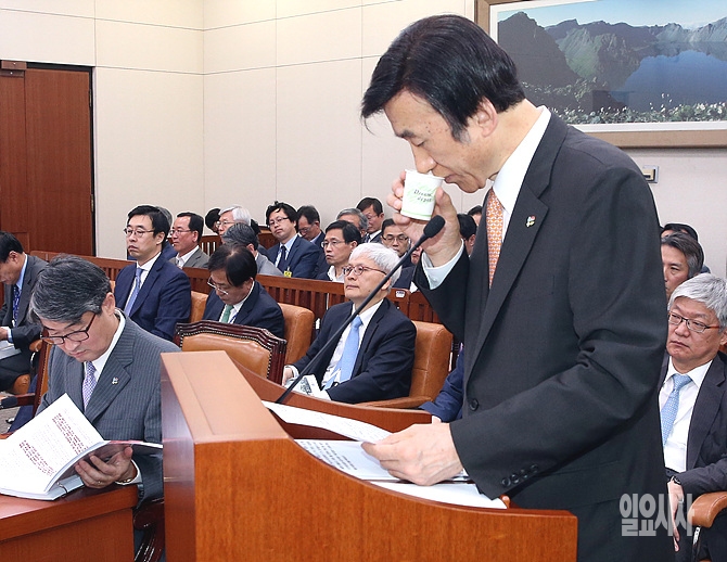 윤병세 외교부 장관이 30일, 국회에서 열린 외교통일위원회 전체회의 직전, 업무보고 도중 물을 들이키고 있다.