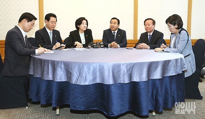 이완구 새누리당·박영선 새정치민주연합 원내대표, 김재원 새누리당·김영록 새정치민주연합 원내수석부대표가 30일, 여의도 국회에서 열린 양당 원내대표 주례회동을 갖고 있다.