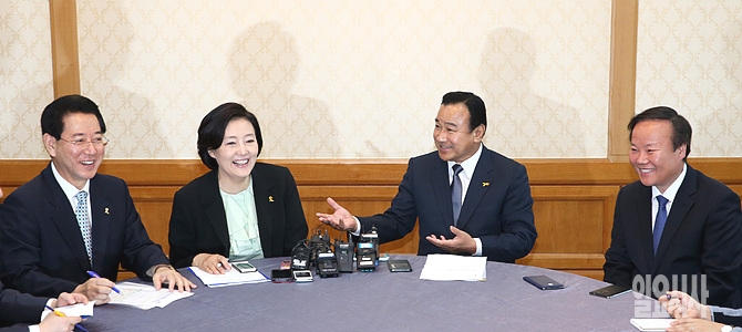 이완구 새누리당 원내대표(사진 오른쪽에서 두 번째)가 30일 오전 여의도 국회에서 열린 양당 원내대표 주례회동에서 발언하는 가운데, 박영선 새정치민주연합 원내대표, 김영록 원내수석부대표, 김재원 새누리당 원내수석부대표가 화기애애한 분위기를 보이고 있다.