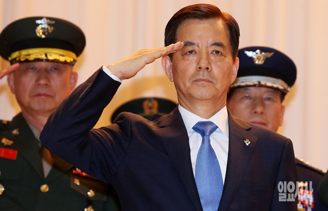 30일 서울 용산구 국방부에서 열린 제43·44대 국방부 장관 이·취임식에서 한민구 신임장관이 거수경례를 하고 있다.