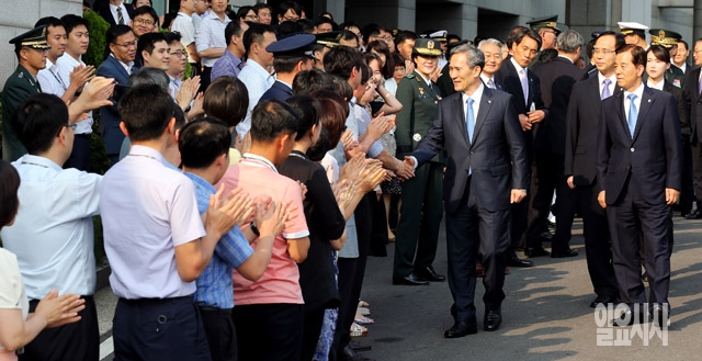 30일 서울 용산구 국방부에서 열린 제43·44대 국방부 장관 이·취임식을 마친 김관진 전 장관이 직원들의 박수를 받으며 청사를 나서고 있다.