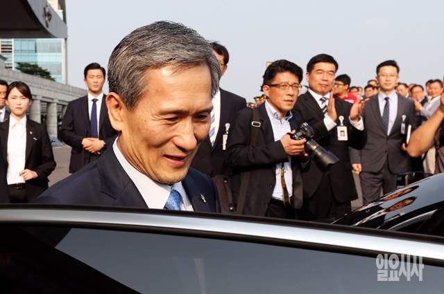 30일 서울 용산구 국방부에서 열린 제43·44대 국방부 장관 이·취임식을 마친 김관진 전 장관이 차량에 탑승하고 있다.