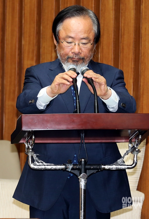 이주영 해양수산부 장관이 1일 서울 여의도 국회에서 열린 세월호침몰사고진상규명국정조사 특별위원회 전체회의에 참석해 기관보고에 앞서 마이크를 만지고 있다.