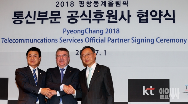 1일 서울 KT 광화문사옥 올레스퀘어 드림홀에서 열린 2018 평창동계올림픽 통신부문 공식 후원사 협약식에서 김진선 2018 평창동계올림픽대회 및 장애인올림픽대회 조직위원장(왼쪽부터), 토마스 바흐 국제올림픽위원회(IOC) 위원장, 황창규 KT 회장이 손을 맞잡고 기념촬영을 하고 있다.