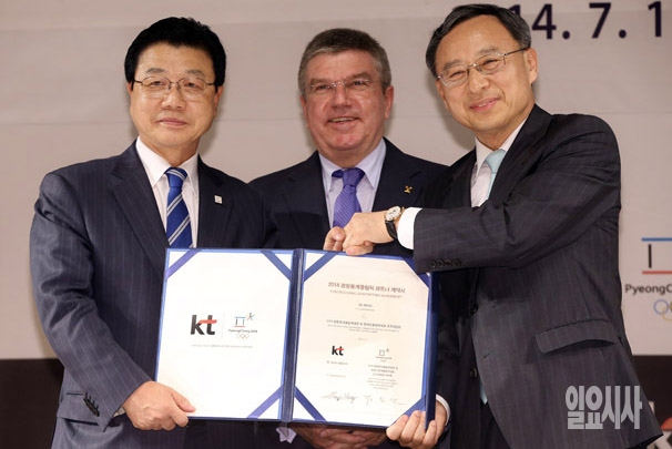 1일 서울 KT 광화문사옥 올레스퀘어 드림홀에서 열린 2018 평창동계올림픽 통신부문 공식 후원사 협약식에서 김진선 2018 평창동계올림픽대회 및 장애인올림픽대회 조직위원장(왼쪽부터), 토마스 바흐 국제올림픽위원회(IOC) 위원장, 황창규 KT 회장이 협약서를 교환한 뒤 기념촬영을 하고 있다.