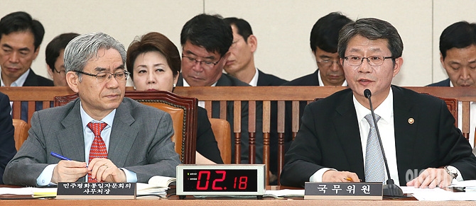 류길재 통일부 장관이 1일, 서울 여의도 국회에서 열린 국회 외교통일위원회 전체회의에서 답변하고 있다. (사진 왼쪽은 민주평통자문회의 박찬봉 사무처장)