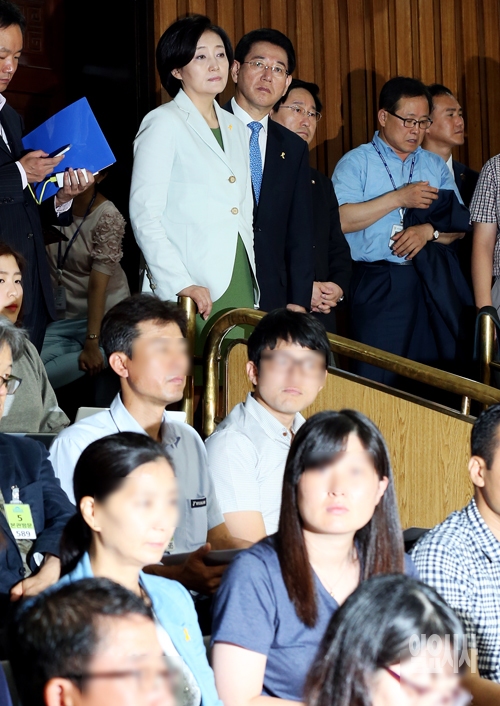 2일 서울 여의도 국회에서 세월호침몰사고진상규명국정조사 특별위원회 전체회의가 열리고 있는 가운데 박영선 새정치민주연합 원내대표가 방문해 회의를 지켜보고 있다.