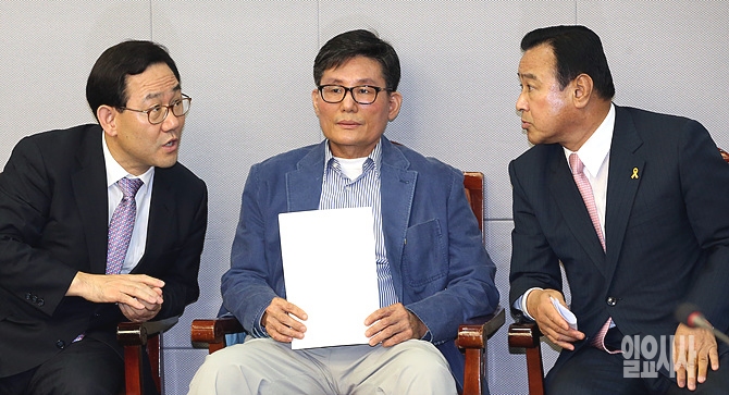 이완구 새누리당 비대위원장 겸 원내대표가 2일, 국회 의원회관에서 쇄신전대추진모임 주최로 열린 '긴급토론! 7·14전당대회 쇄신과 새누리당의 미래'에서 주호영 정책위의장과 이야기를 나누고 있다.