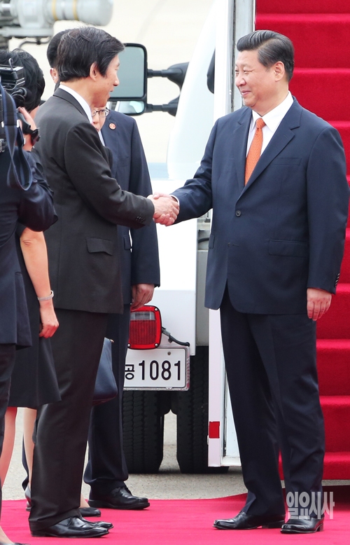 시진핑 중국 국가주석이 3일 경기도 성남 서울공항을 통해 입국, 영접나온 윤병세 외교부 장관과 인사하고 있다.