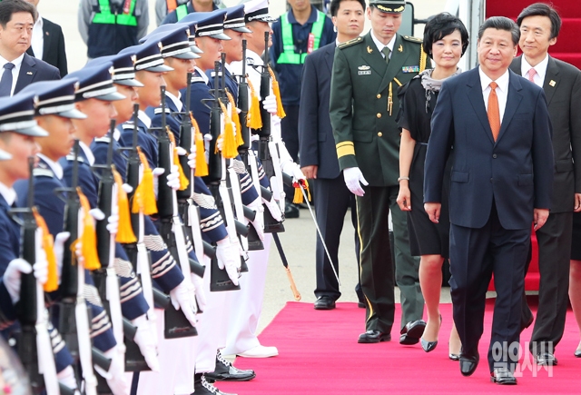 시진핑 중국 국가주석이 3일 경기도 성남 서울공항을 통해 입국, 의장대를 사열하고 있다.