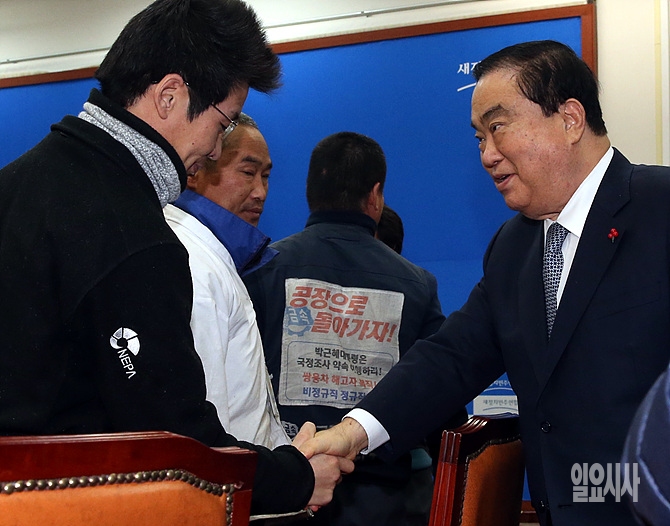 12일, 서울 여의도 국회에서 문희상 새정치민주연합 비상대책위원장이 쌍용자동차 희생자 추모 및 해고복직자 범국민대책위원회 관계자와 악수를 나누고 있다.