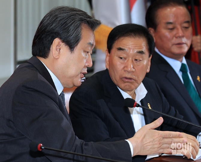 새누리당 김무성 대표와 이재오 최고위원이 15일 오후 서울 여의도 국회에서 열린 최고중진연석회의에서 대화를 나누고 있다.