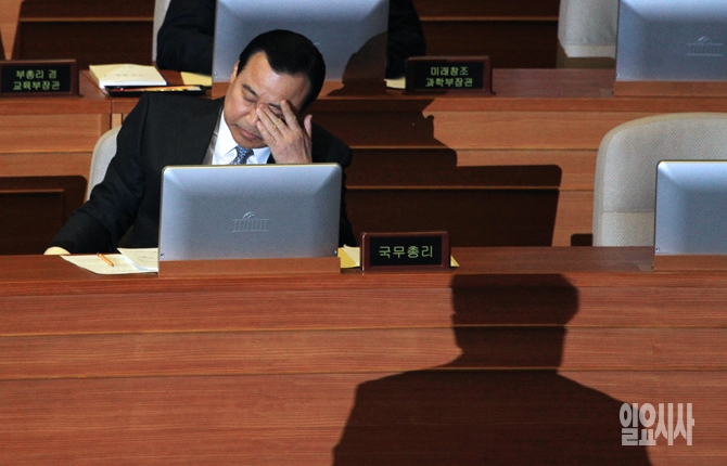 고 성완종 전 경남기업 회장으로부터 선거자금 수수 의혹을 받고 있는 이완구 국무총리가 15일 오전 국회에서 열린 대정부 질문에서 손으로 얼굴을 만지고 있다.