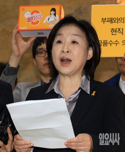 심상정 정의당 원내대표가 15일 오전 서울 여의도 국회 로텐더홀에서 이완구 총리의 자진사퇴를 촉구하는 기자회견을 열고 있다.