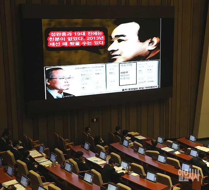 15일, 서울 여의도 국회 본회의장서 열린 국회 대정부질문 도중 이른바 '성완종 리스트'에 이름이 올라 있는 이완구 국무총리의 거짓 발언과 관련해 한 야당 의원이 관련자료를 증거로 제시하고 있다.