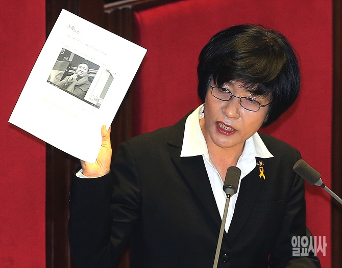 15일, 서울 여의도 국회 본회의장서 열린 국회 대정부질문 도중 새정치민주연합 김영주 의원이 이른바 '성완종 리스트'에 이름이 올라 있는 이완구 국무총리에게 자료를 들어보이며 질의하고 있다.