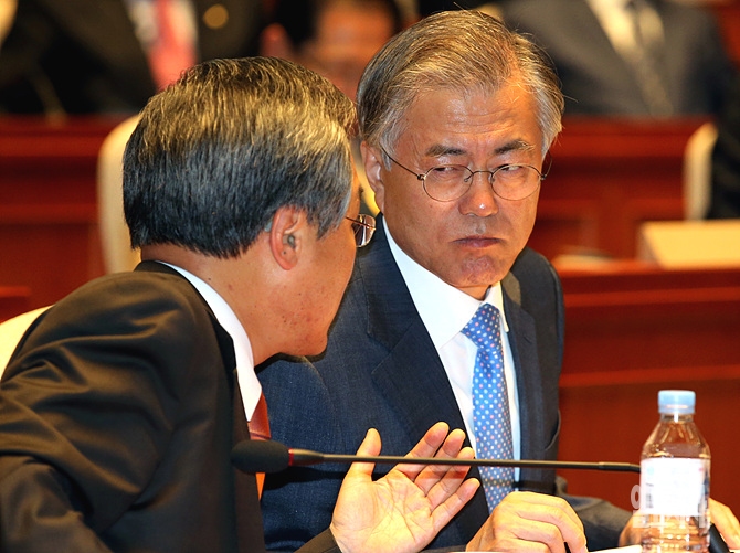 6일, 서울 여의도 국회에서 열린 새정치민주연합 의원총회 도중 문재인 대표가 우윤근 원내대표와 이야기 도중 심각한 표정을 짓고 있다.