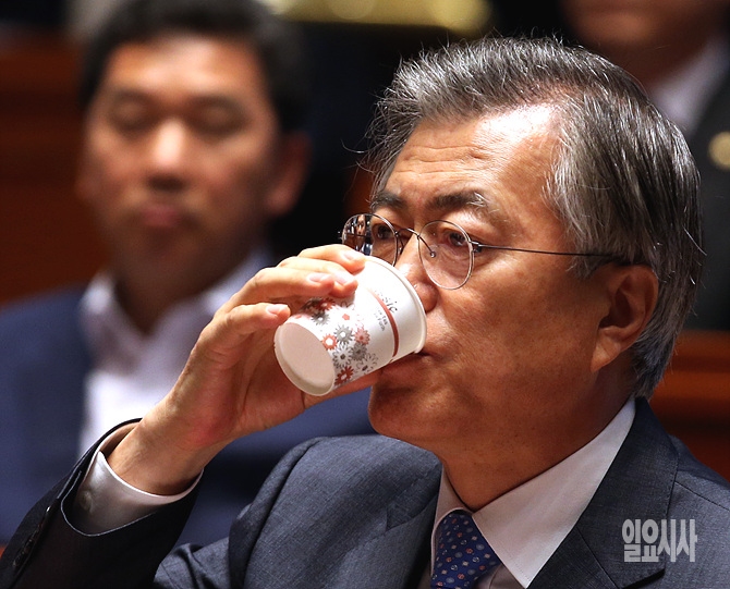 6일, 서울 여의도 국회에서 새정치민주연합 의원총회가 열린 가운데, 문재인 대표가 목이 타는 듯 물을 들이키고 있다.
