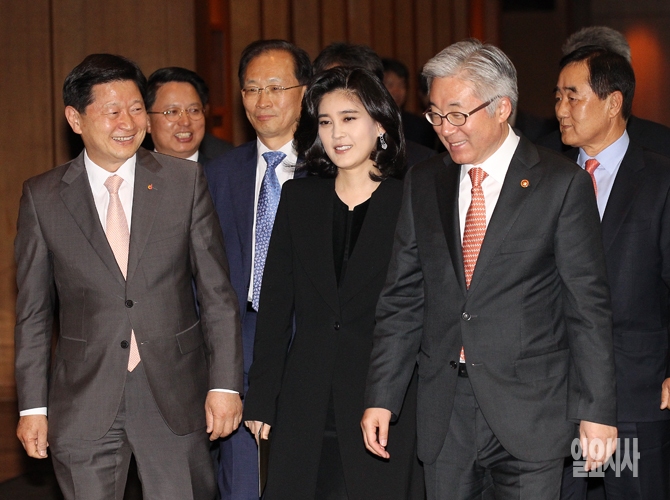 최창식(왼쪽부터) 서울중구청장, 이부진 신라호텔 사장, 김종덕 문화체육관광부 장관이 7일 오전 서울 중구 장충동 신라호텔에서 열린 '5성 호텔 1호 현판식'에 참석하고 있다.