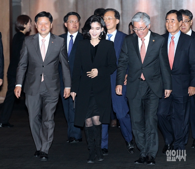 이부진 신라호텔 사장과 김종덕 문화체육관광부 장관을 비롯한 인사가 7일 오전 서울 중구 장충동 신라호텔에서 열린 '5성 호텔 1호 현판식'에 참석하고 있다.