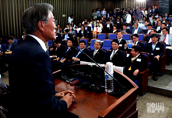 7일, 서울 여의도 국회 본청에서 새정치민주연합 원내대표 선출을 위한 의원총회 직전, 문재인 대표가 발언고 있다.