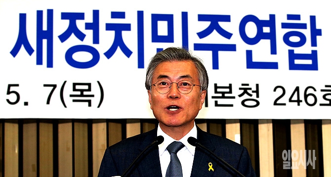 7일, 서울 여의도 국회 본청에서 새정치민주연합 원내대표 선출을 위한 의원총회가 열린 가운데, 문재인 대표가 최재성·김동철·설훈·조정식·이종걸 5인의 후보자들에게 파이팅을 주문하고 있다.