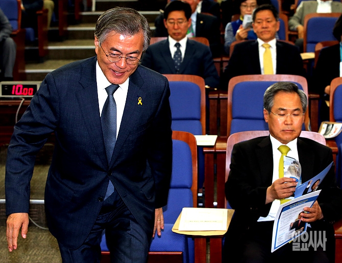 7일, 서울 여의도 국회 본청에서 새정치민주연합 원내대표 선출을 위한 의원총회가 열린 가운데, 문재인 대표가 발언을 위해 단상을 향하고 있다.