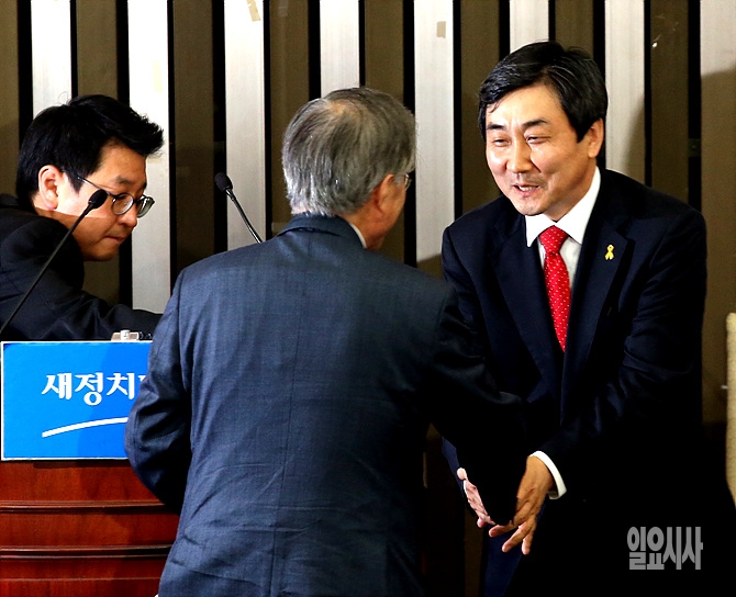 7일, 서울 여의도 국회 본청에서 열린 새정치민주연합 원내대표 선출을 위한 의원총회에서 문재인 대표가 이종걸 신임 원내대표와 축하의 악수를 나누고 있다.